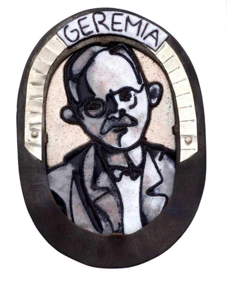 Enamel on copper, copper setting, sterling accents, steel pinback